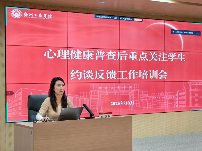为扎实做好学生心理健康普查后重点关注学生的约谈反馈工作,提升各学院对学生心理需求的回应能力与关怀实效,2025年10月17日,心理健康教育中心组织召开心理健康普查后重点关注学生约谈反馈工作专题培训会。会议在怀德讲堂设主会场,学生处副处长吴鹏、田博出席,各学院团总支书记、各年级负责人、心理专员及心理健康教育中心全体教师参会,兰考学院线上同步参会。会议由心理健康教育中心主任谷洋帆主持。