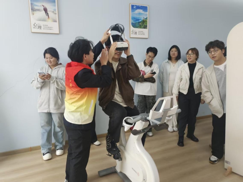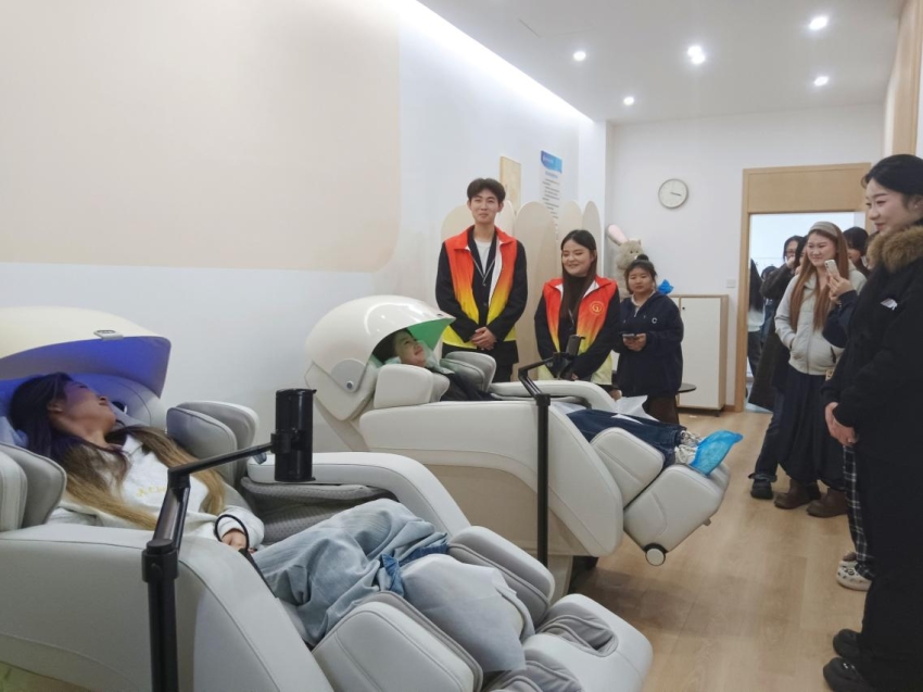 在朋辈心理互助中心解说员的引导下,同学们依次走进心理健康教育中心,实地了解中心的日常运作与服务内容。大家现场体验了音乐放松室、智能宣泄室等多个功能区域的设备,在互动中加深了对心理调适设施的认识与理解。