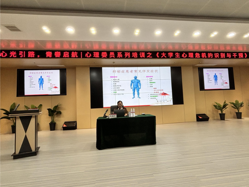 随后,孔德荣以“大学生常见心理障碍的识别与干预策略”为主题,结合丰富的临床经验,系统解读了当前大学生心理健康的严峻现状。深入剖析了大学生的心理特点并详细介绍了恐惧、焦虑、强迫、抑郁及精神分裂症等常见心理障碍的识别标准与典型症状。针对不同心理问题,提出科学的干预原则与实用方法,强调要建立“学校-学院-班级-宿舍”四级预警防控体系,必要时及时转介专业医疗机构。提醒心理委员关注同学的情绪变化,及时发现心理危机的早期征兆。